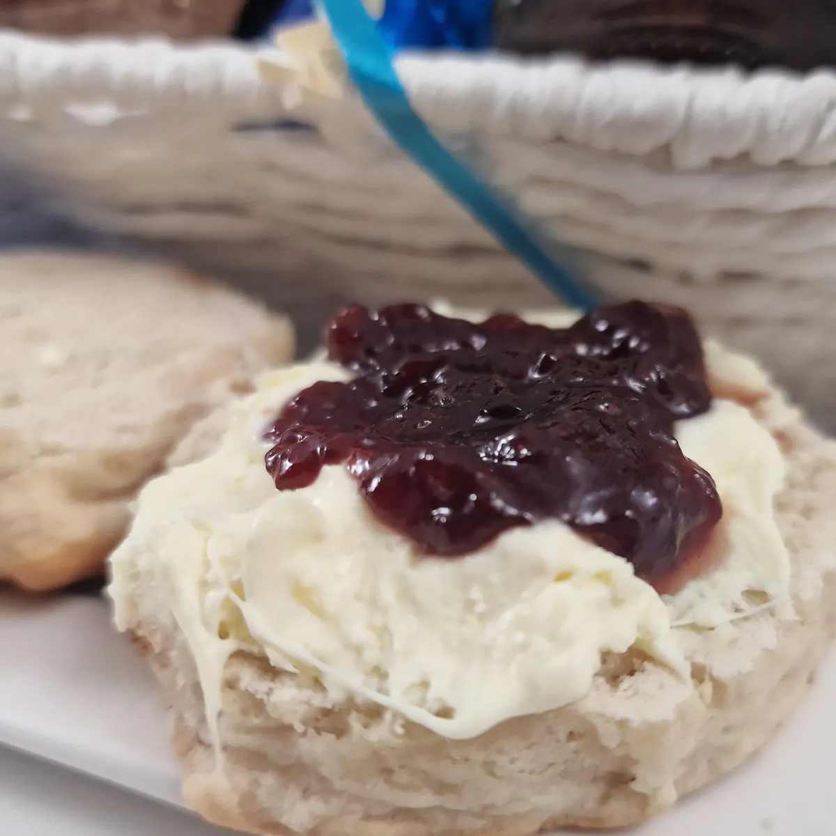 Cornish Clotted Cream and Plum Jam (in which order is hotly debated!) and enjoy with a cup of English Breakfast Tea.