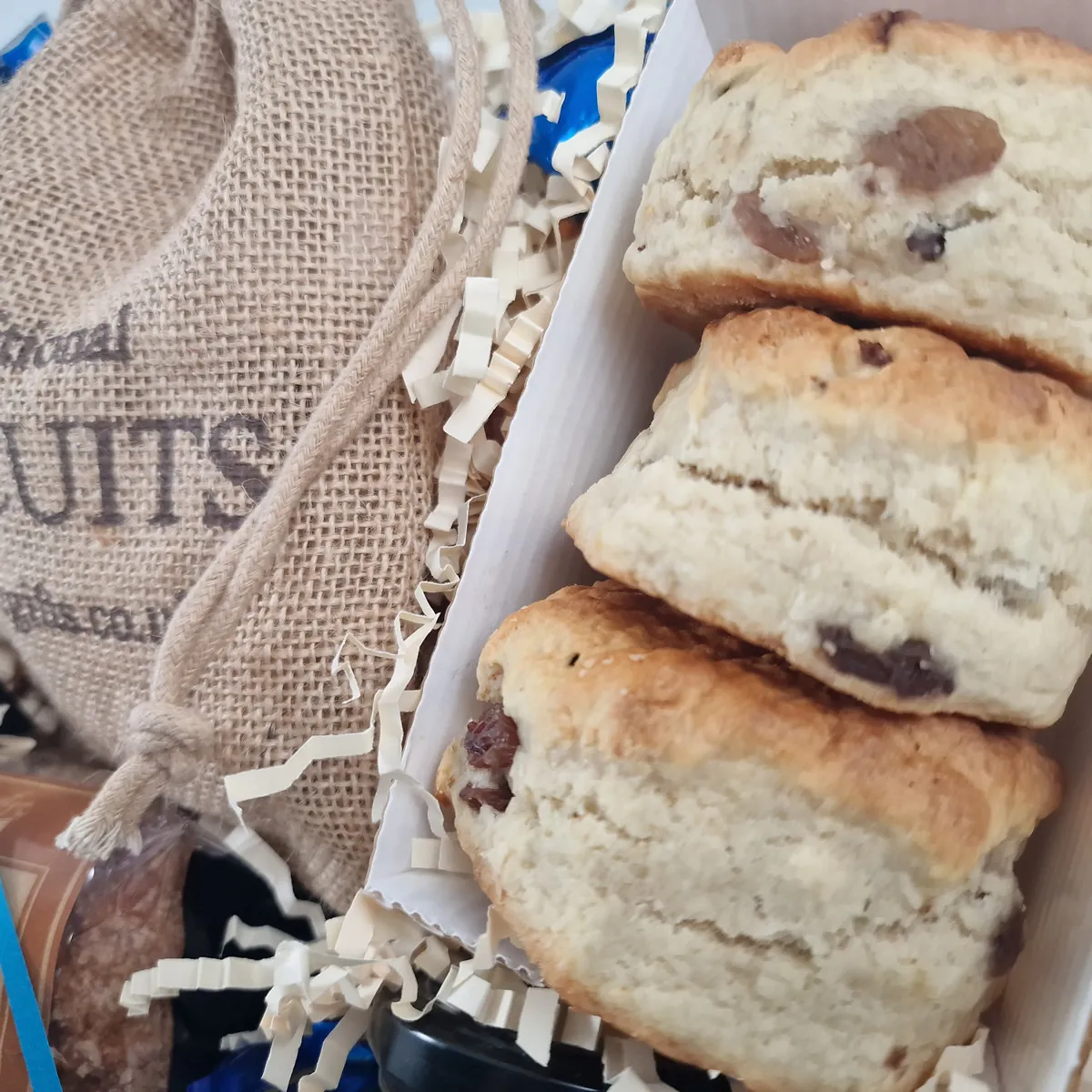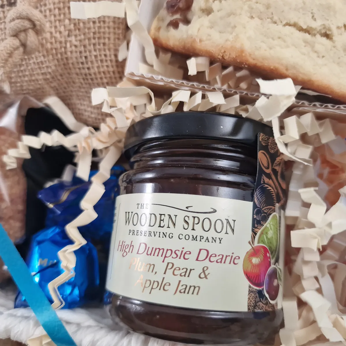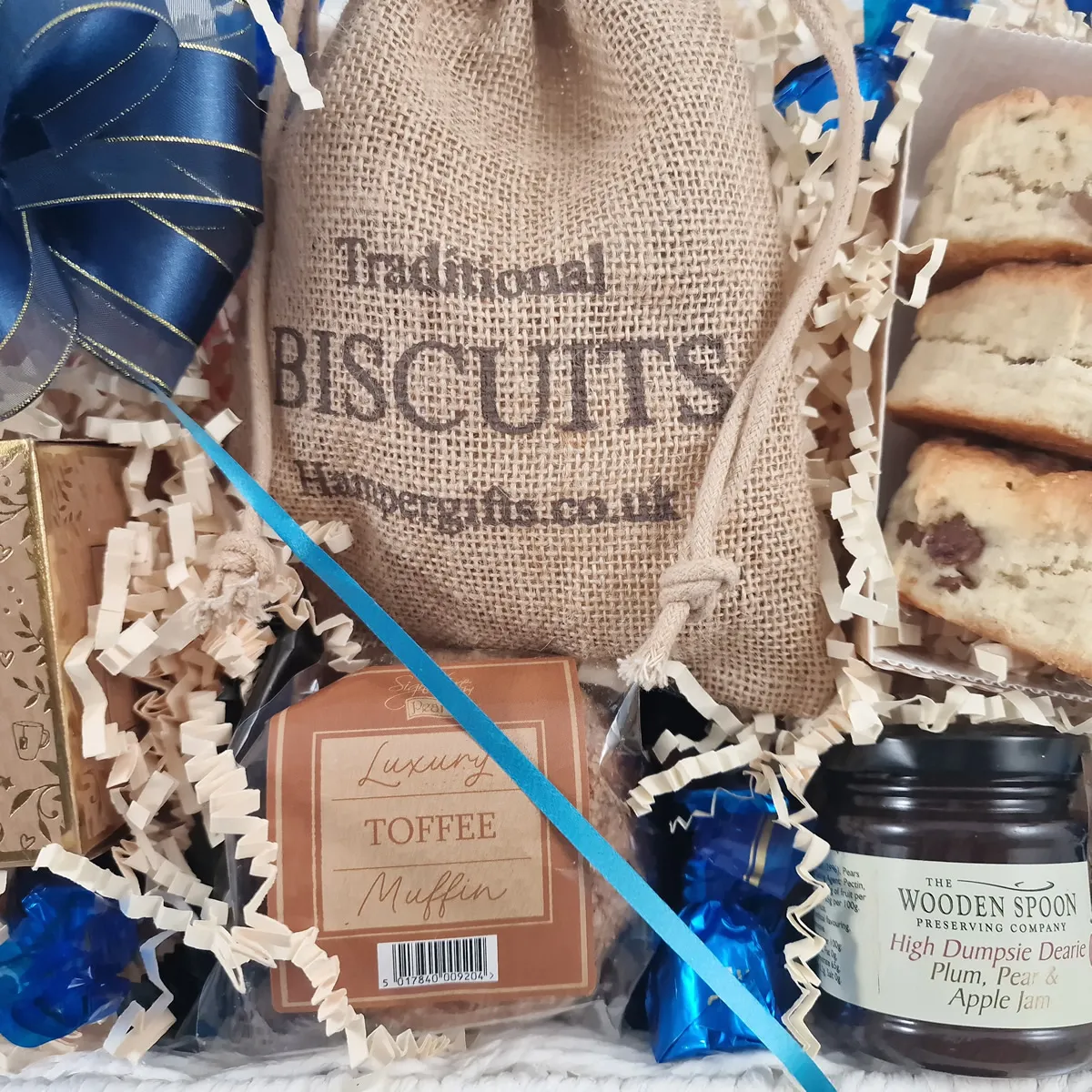 Afternoon Tea Hamper filled with premium British treats. Inside, they'll discover 4 all butter Sultana Scones - made with buttermilk for a light, fluffy texture. Spread on generous dollops of the award-winning