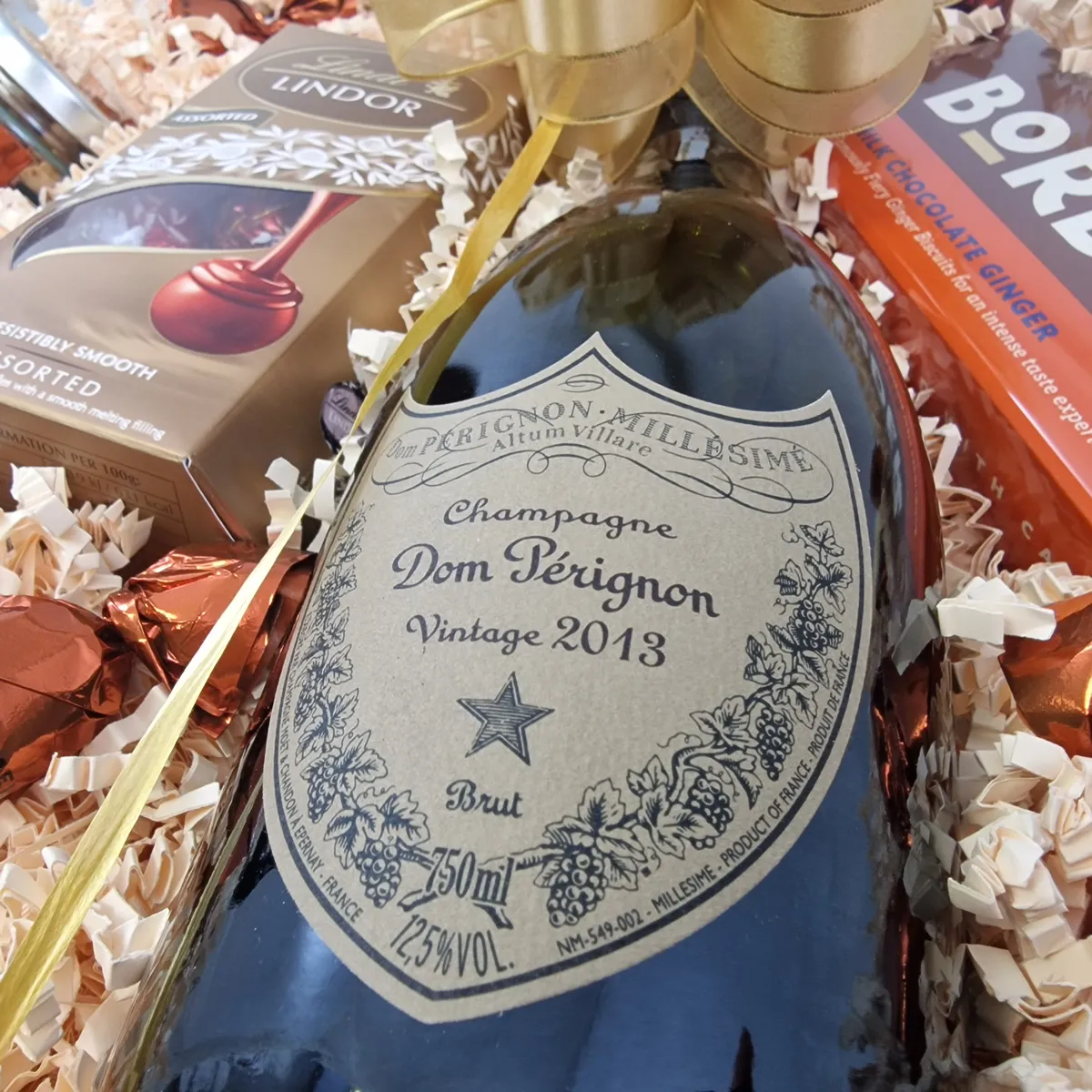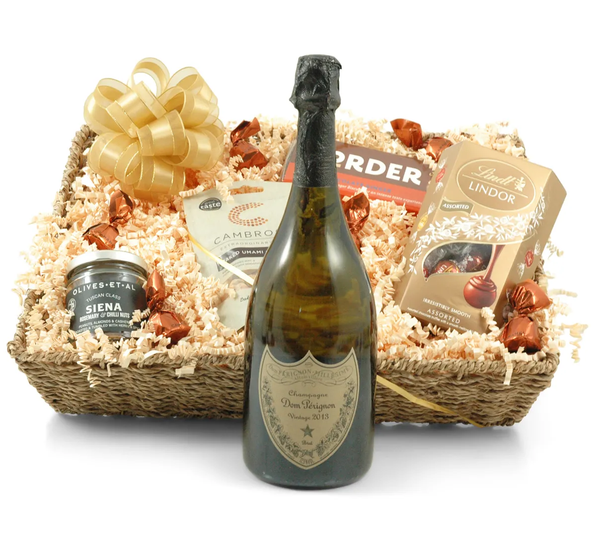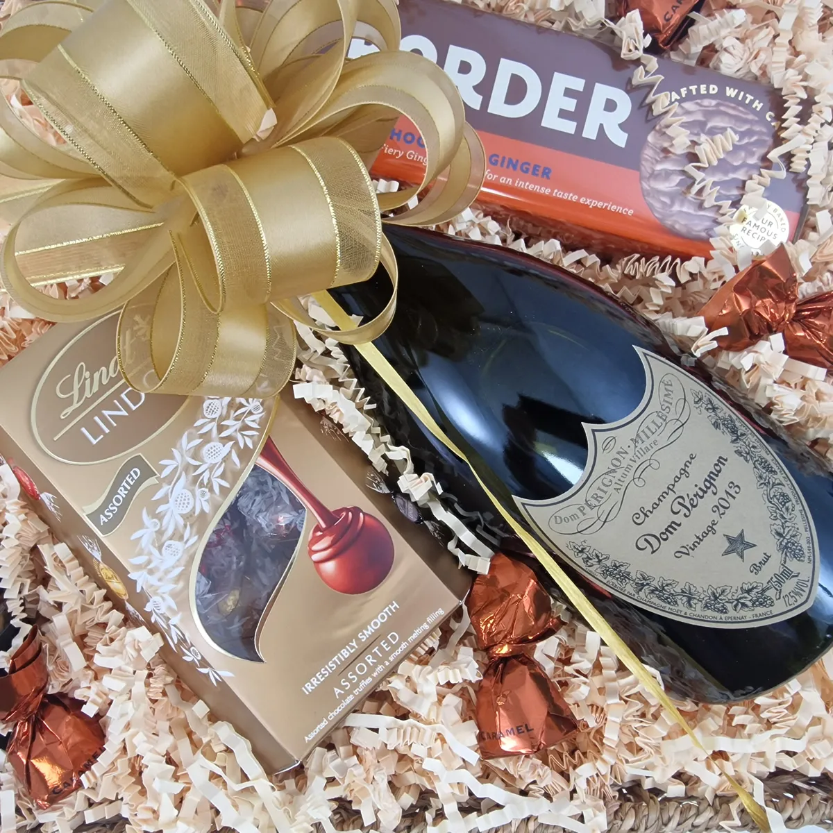 pop open now for a special celebration. Dom Pérignon exists only as a vintage wine; to bring out the nuances of a single year's harvest, using only the finest grapes. We've combined this iconic champagne with a few select treats including truffles from master chocolatiers Lindt, medal-winning spiced nuts, award-winning chocolate biscuits and Belgian caramel pralines - all presented in a reusable seagrass basket and hand-tied with a flourish of gold ribbon. Send this stunning hamper to mark any special occasion. Ideal for a birthday, anniversary or as a corporate thank you.