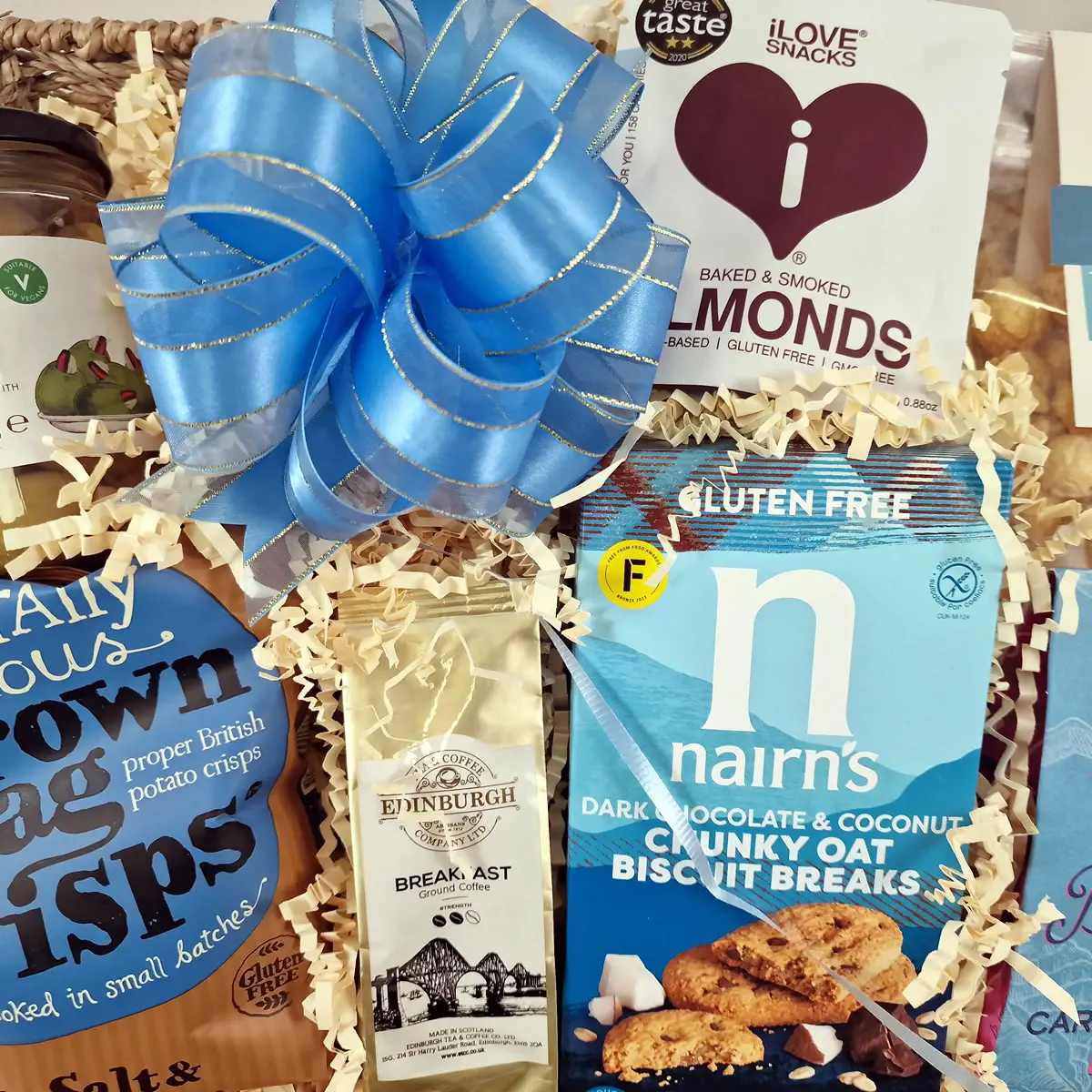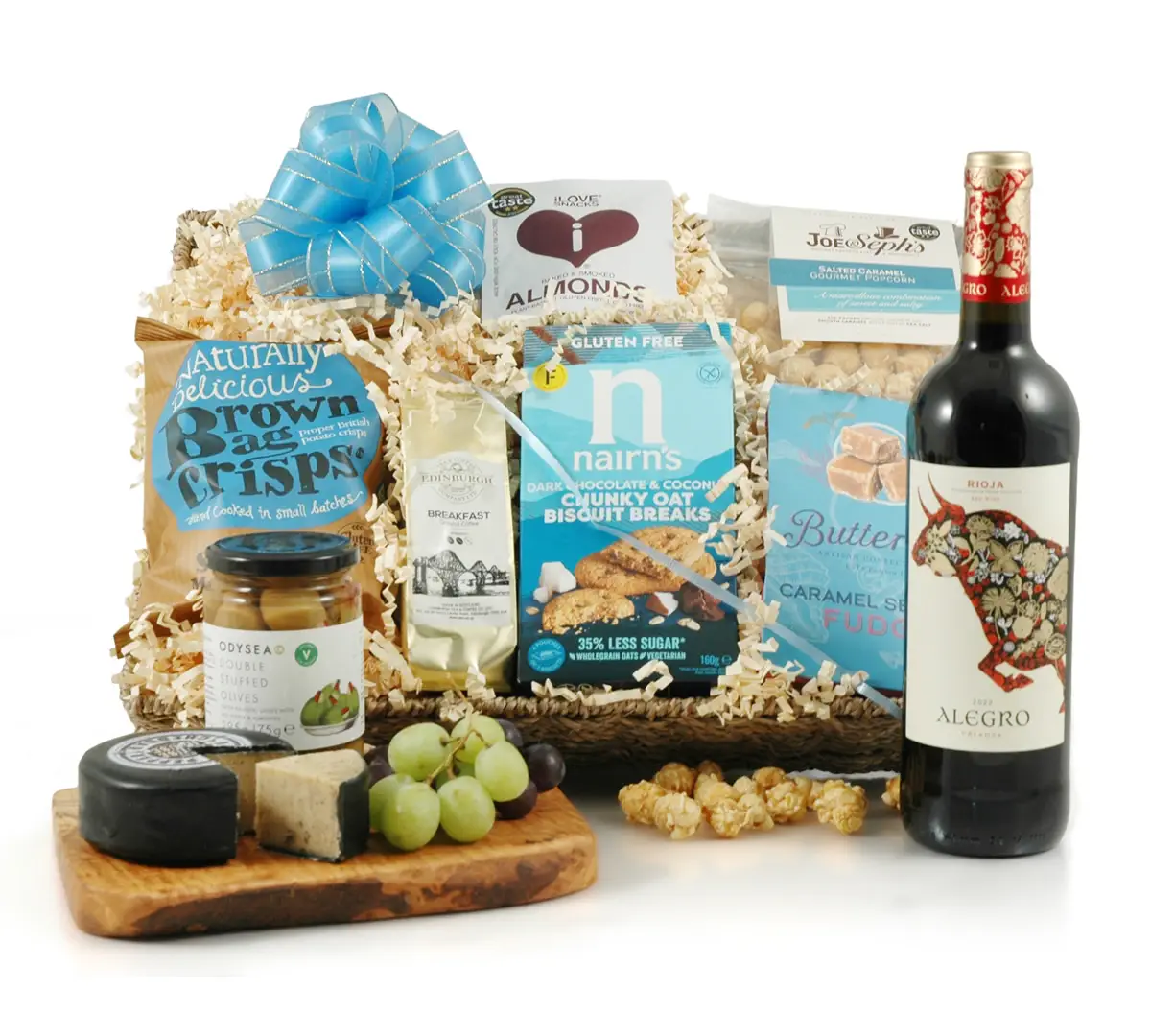 Discover the ultimate indulgence with our Luxury Gluten-Free Wine and Cheese Hamper. This exquisite gift basket features a spectacular line-up of premium treats, anchored by an award-winning Rioja and a Waxed Cheddar truckle with Black Pepper. Complemented by artisan coffee and six more award-winning delights — including Nairn's oat biscuits, double stuffed olives, Buttermilk sea salt fudge, smoked almonds, Brown Bag crisps, and caramel popcorn. Arriving in a gorgeous, reusable woven basket, your gift is lovingly secured with 100% biodegradable eco-packaging and elegantly finished with ribbon. Add a free personalised message and select your free nominated delivery date at checkout for the perfect luxury gluten free gift.