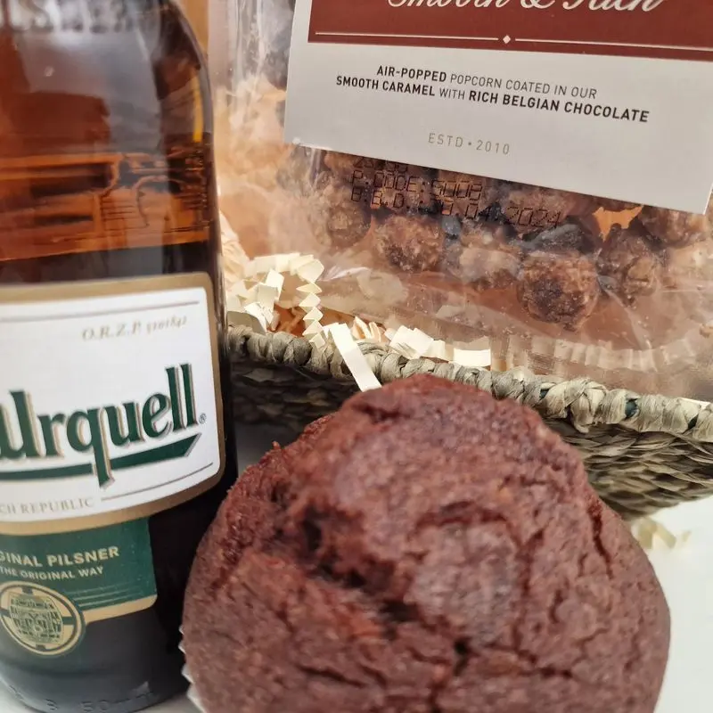 3 x bottles of crisp Czech lager and a lovely selection of snacks to complement the beer. On the savoury side there are utterly addictive Smoked Almonds as well as award-winning Lightly Salted Crisps. For those with a sweet tooth try the medal-winning Caramelised Sesame Peanuts, Double Chocolate Muffin or the Gourmet Belgian Chocolate Popcorn. This excellent value beer hamper is a perfect hamper for Father's Day, a birthday, a movie night in or as a thoughtful 'Thank You' for any beer aficionado.