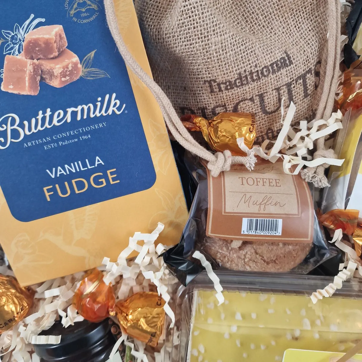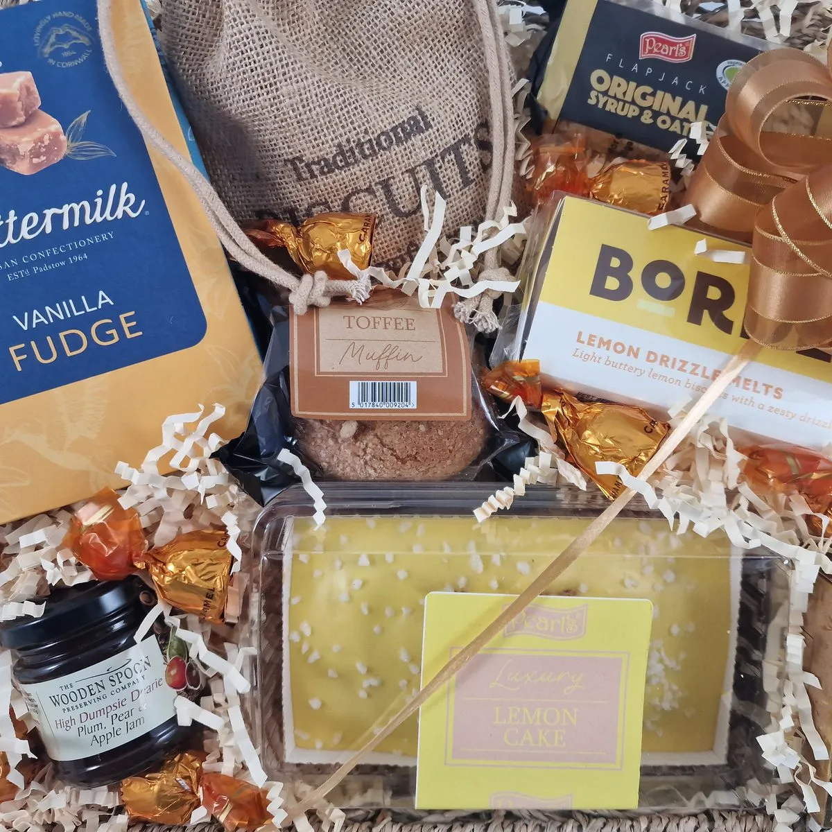 Cornish Clotted Cream & Plum Jam and enjoy with a cup of English Breakfast Tea. The sweet treats continue with award-winning Cornish Vanilla Fudge, a soft buttery Toffee Muffin, Caramels, Biscuits, and a generously sized Lemon Cake. Beautifully presented in a reusable seagrass basket and hand-tied with ribbon, this hamper is perfect for birthdays, anniversaries, thank-you’s, or simply as a gesture of affection. A luxurious hamper to savour at home, in the garden, or on a family picnic.