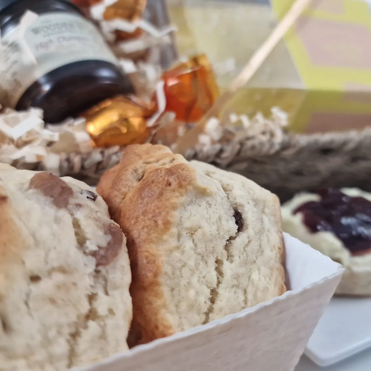 Afternoon Cream Tea Gift Hamper, filled with artisan treats. Nestled within, you’ll find 4 All Butter Sultana Scones made with buttermilk for a light, fluffy texture. Spread on generous dollops of the award-winning
