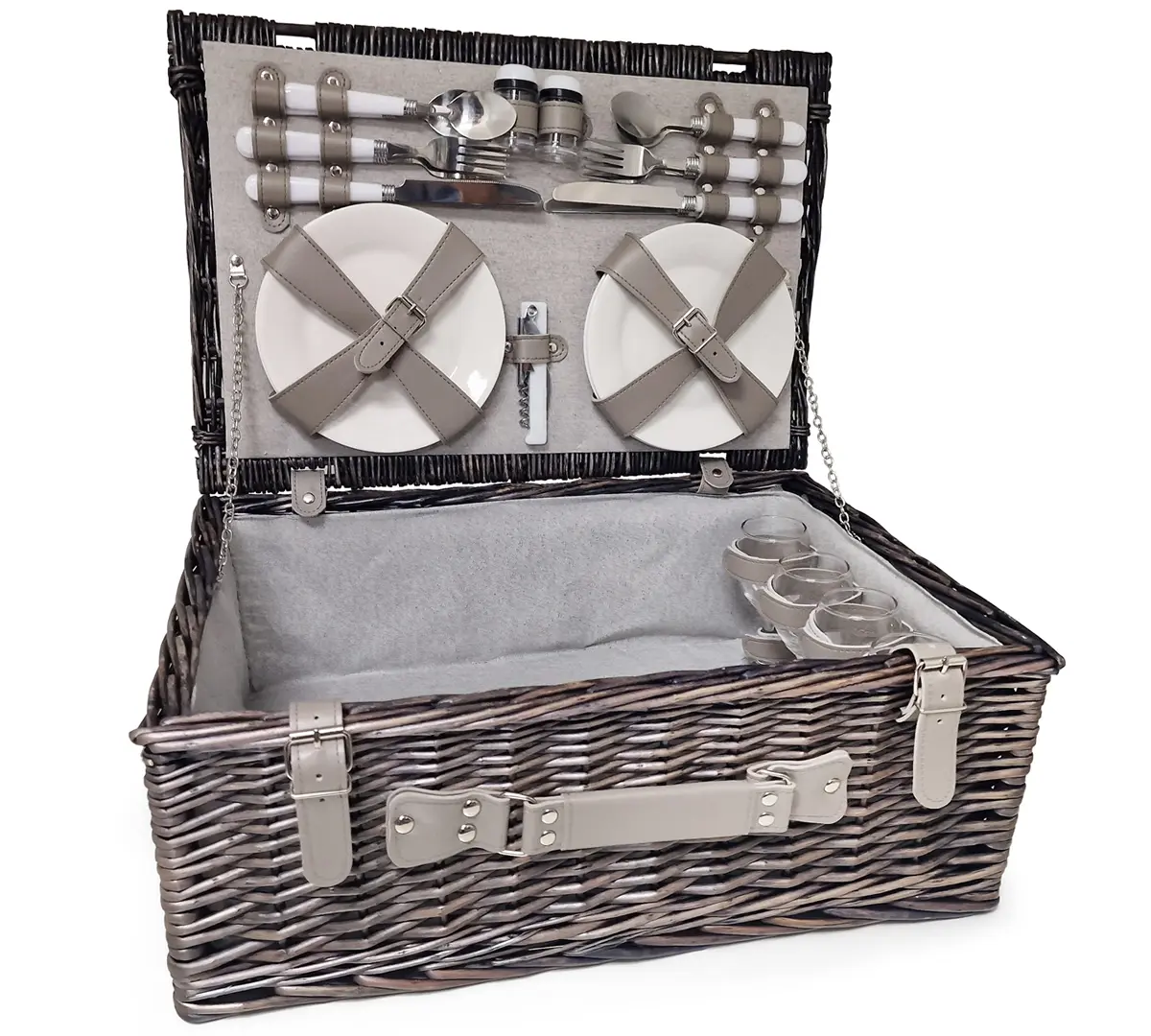 This premium 4-person picnic hamper is your ticket to a perfect outdoor feast. It comes fully equipped with cutlery, crockery, and wine glasses, leaving you free to indulge in the fine spread inside, which includes no less than 7 Great Taste Award winners. Start your meal with the pair of award-winning cheese - a creamy Blue Stilton plus a classic Cheddar Truckle. Next open the award-winning Spiced Olives and Umami Cashews. The medal-winning Sourdough Flatbreads pair wonderfully with the Aubergine Meze Dip and the Farmhouse Pate. And for dessert, savor the Sicilian Lemon Cookies, Belgian Chocolate Truffles, and the pair of Sweet American Style Chocolate Muffins. The sturdy wicker picnic basket comes with a hinged lid and leather handle and straps. And if the weather looks promising, we offer fast next-day delivery for this alcohol-free picnic hamper.