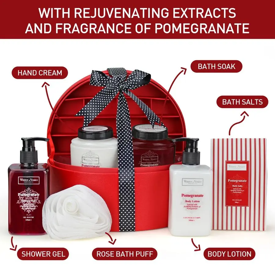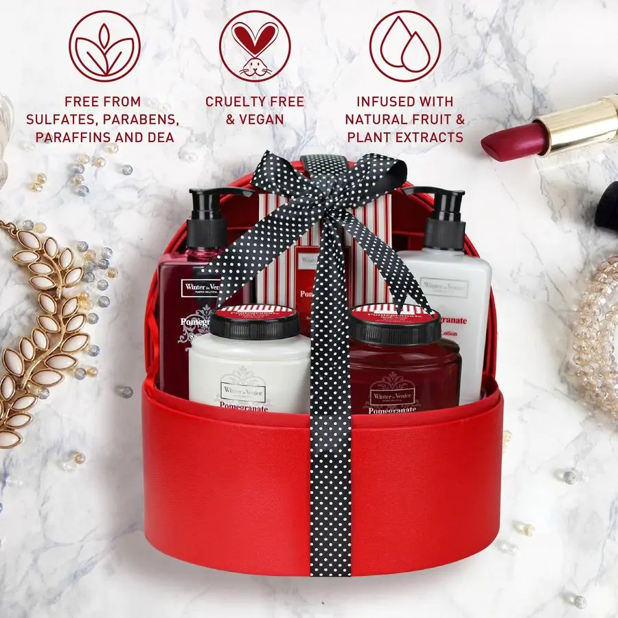 Enriched with extracts of pomegranate, this gorgeous set contains a collection of bath essentials presented in a reusable jewellery. Unwind with the vitamin-infused bath soak, shower gel, body lotion, bath soak and hand cream. With a formula including Cocoa Butter, Mango Butter and Evening Primrose Oil, the half moon shaped jewellery box is an ideal all-in-one pamper gift, perfect for any occasion. Vegan, Paraben free and not tested on animals