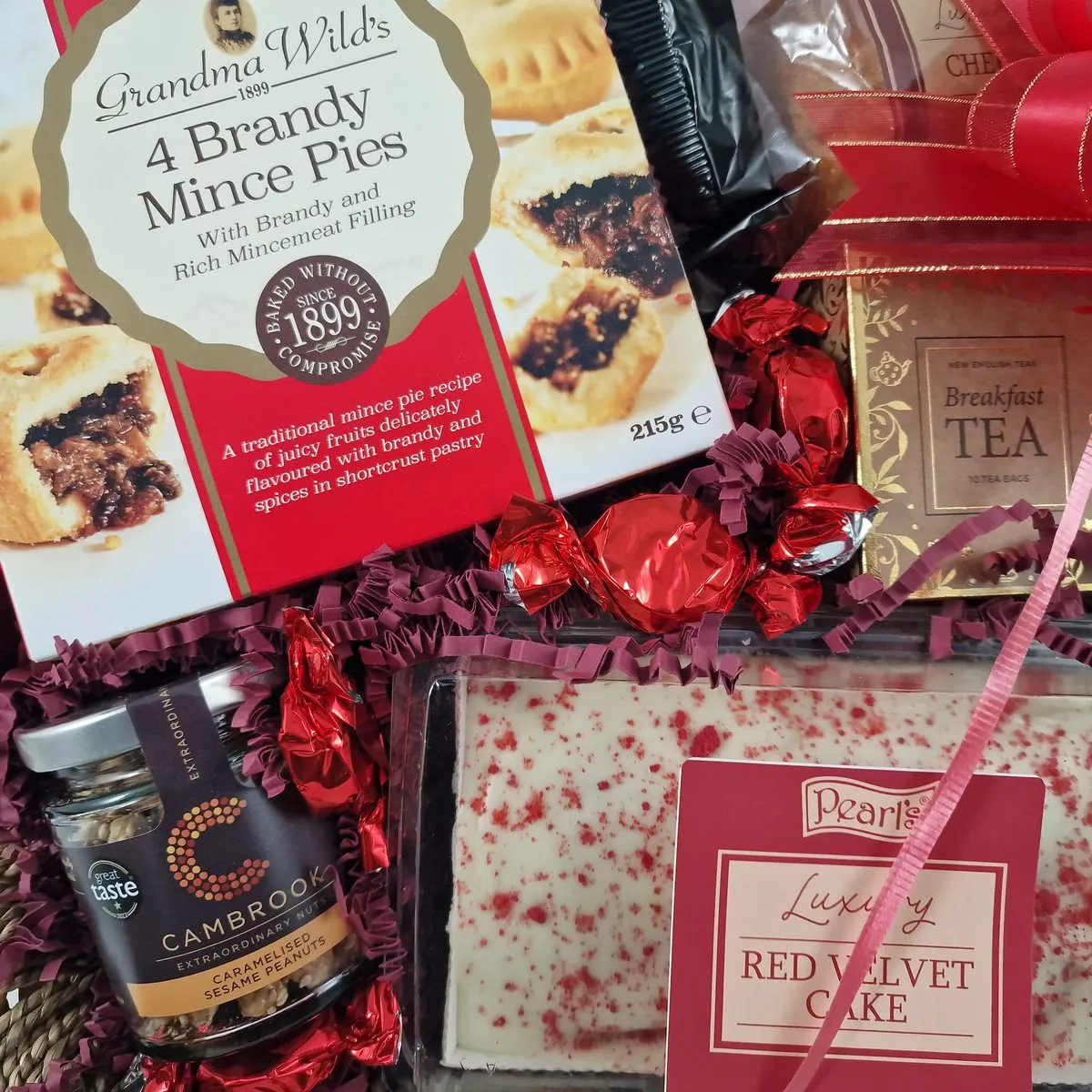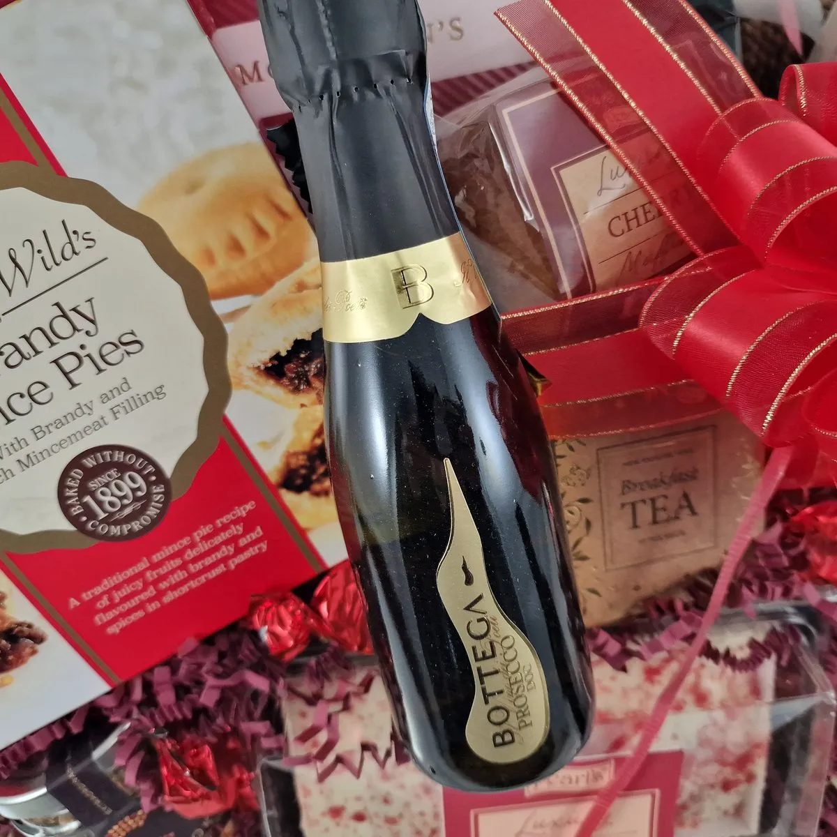 Treat someone special with our curated Prestige Christmas Hamper. Hand-tied with red ribbon and presented in a reusable seagrass basket, this beautifully presented hamper is sure to impress. Inside, they'll find a host of seasonal favourites including Brandy Mince Pies, Butter Shortbread, family-sized Red Velvet Cake, Caramelised Nuts and award-winning Ginger Biscuits. To add sparkle, there's a 20cl Prosecco and 37.5cl Red Wine - smaller bottles ideal for sharing a festive toast. And for an afternoon treat, we've also included Fresh Ground Coffee, English Breakfast Tea, and a juicy Cherry Muffin. Whether you're surprising family, saying thank you to colleagues, or sending holiday love to a friend far away, this hamper delivers festive cheer in every bite. Order now for fast UK delivery.