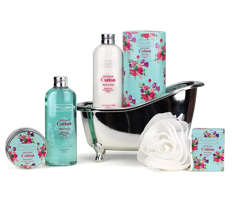 A bath and beauty gift with a timeless twist, the Vintage Cotton Bath Tub is perfect for somebody who loves nothing more than a long pampering session. Nestled inside this delightful Victorian style reusable bathtub caddy are an array of scented goodies including a body butter, shower gel, bath pearls, body soap, and a body lotion. A rose shaped bath puff completes this enchanting collection. The bath treats have the calming properties of Lily Extract and are infused with Cocoa Butter, Mango Butter and Evening Primrose Oil. This charming hand-finished pamper gift is Vegan and free from parabens, paraffins, sulphates, mineral oils and DEA; and not tested on animals.